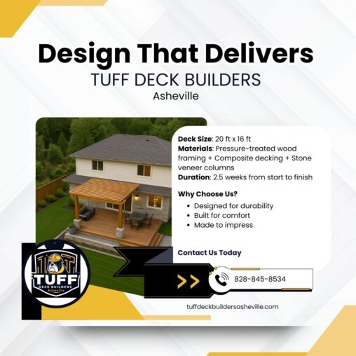 A well-crafted porch adds charm and comfort to any home. Tuff Deck Builders Asheville is your trusted porch builder near me, serving Asheville, Charlotte Street, Mountainbrook, East End – Valley Street, Wind Oaks Town Homes, Redwood Forest, Beverly Hills, Haw Creek, South French Broad, Huston – Courtland, Westwood Place, Emma, Burton Street, River Arts District, Hillcrest, Albemarle, Montford Area Historic District, Five Points, Woolsey, Grace, Echo Hills, Pisgah View, Bear Creek, Falconhurst, and Lucerne Park. Licensed and insured, we use high-quality materials and expert craftsmanship to design porches that last for years. Contact us today for a free quote—serving Asheville and surrounding areas. Call now to discuss your deck installation in Asheville and nearby towns. Let’s start building your dream deck today!