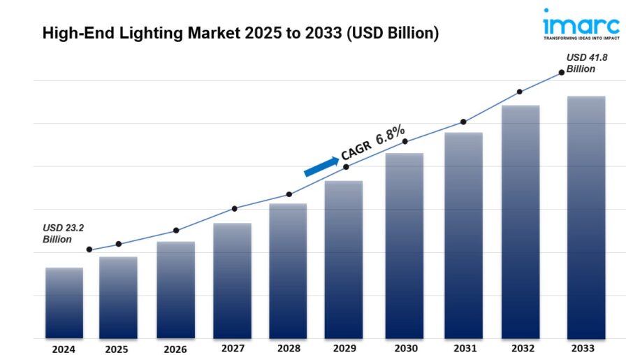 The global high-end lighting market size reached USD 23.2 Billion in 2024 and is expected to reach USD 41.8 Billion by 2033, exhibiting a growth rate (CAGR) of 6.8% during 2025-2033. The increasing demand for premium lighting to improve the ambiance, the growing demand for energy-efficient solutions to encourage sustainability, and emerging technological advancements offering innovative designs and smart functionalities are some of the major factors propelling the market.