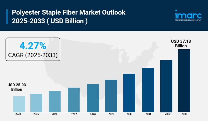 The global polyester staple fiber market size was valued at USD 25.03 Billion in 2024. Looking forward, IMARC Group estimates the market to reach USD 37.18 Billion by 2033, exhibiting a CAGR of 4.27% during 2025-2033. Asia-Pacific currently dominates the market, holding a significant market share of over 77.6% in 2024. The market is driven by rising textile demand, particularly in fast-fashion and activewear, due to its affordability and durability. Growth in non-woven applications such as automotive, construction, and hygiene products enhances consumption. Urbanization and disposable income growth in emerging economies are further expanding the polyester staple fiber market share. Additionally, PSF’s cost and performance advantages over natural fibers drive adoption, while innovations in fiber technology and expanding industrial uses sustain long-term market expansion.