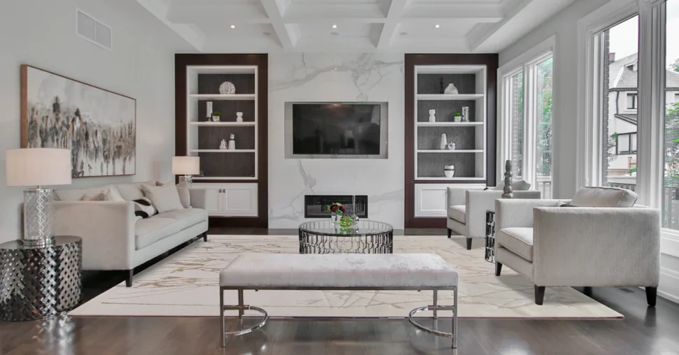 Place a Persian or Turkish rug under the sofa and coffee table to anchor the seating area. Pair with neutral furniture to let the rug’s patterns shine.